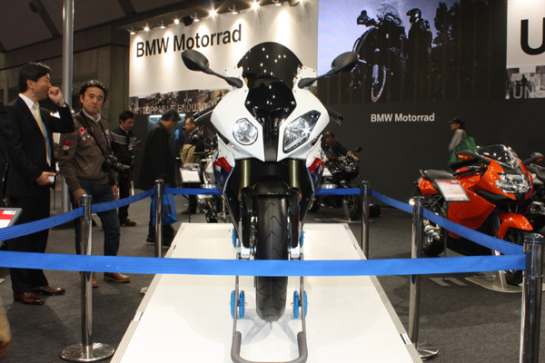 2009年 WSBK に初参戦し、翌2010年には受注販売を開始し、4月以降順次納車予定。特別なキャラクターだけあって最も高い位置に展示。写真はカーボン素材のフェアリング、削り出しのステップなど高品質な HP (ハイパフォーマンス)パーツフル装備した状態。ハイウィンドシールドやリアシートカバーも。