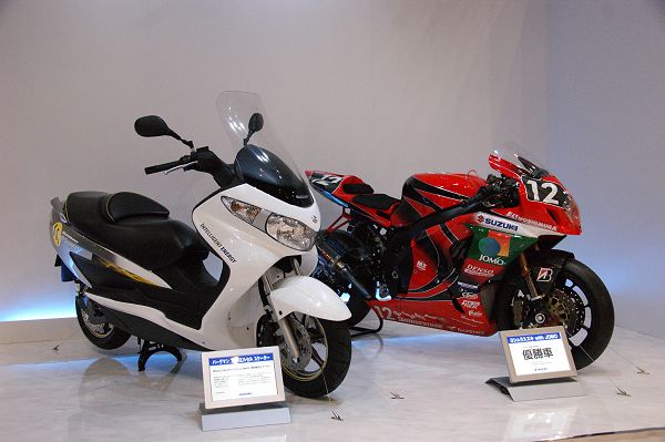 スズキブースは「バーグマン フューエルセル スクーター(参考出品車)」が見どころ。このモデルは空冷式燃料電池を搭載し、水素タンクの高圧化によりその後続距離は350kmに達するという。2009年鈴鹿8耐の優勝マシンGSX-R1000(酒井大作・徳留和樹・青木宣篤 組)やV-Strom 650 ABS(海外向けモデル)なども展示。